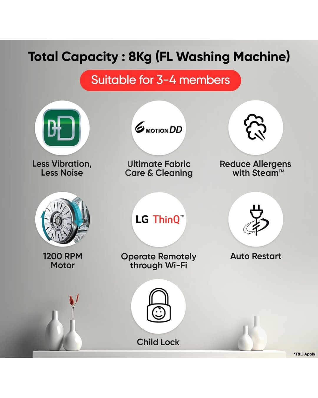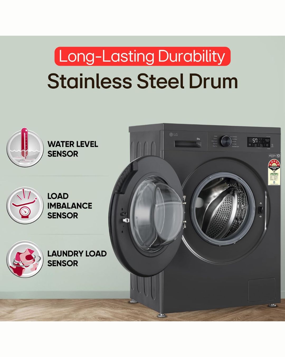 Utilising LG’s Steam technology, this 12kg washing machine eliminates viruses and allergens, including dust mites that can trigger allergies and respiratory issues. Additionally, it reduces wrinkles, ensuring garments come out fresh and smooth.