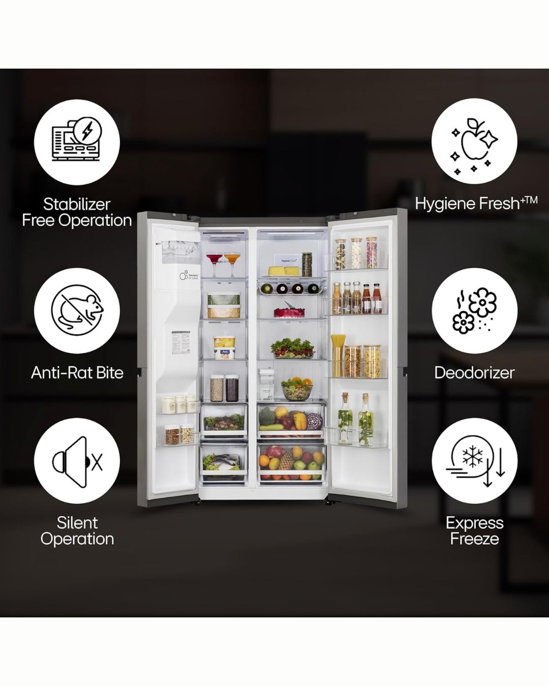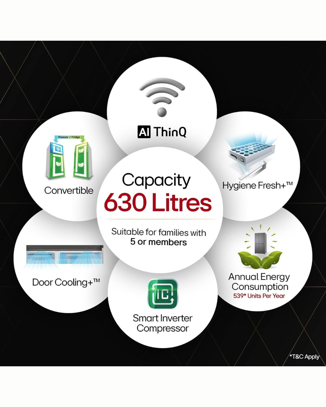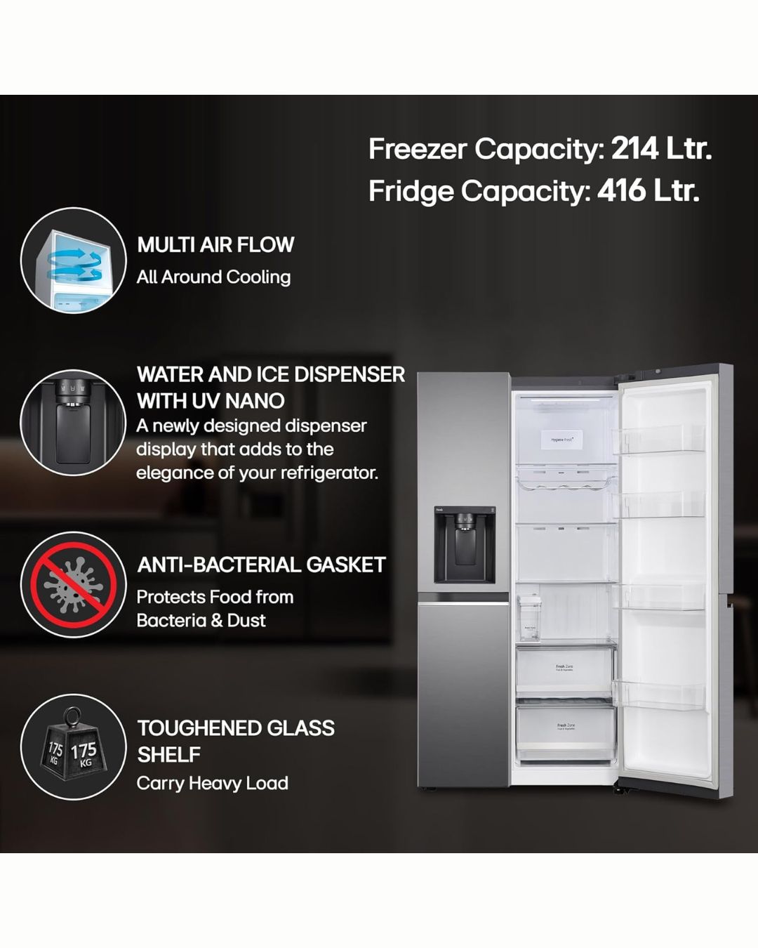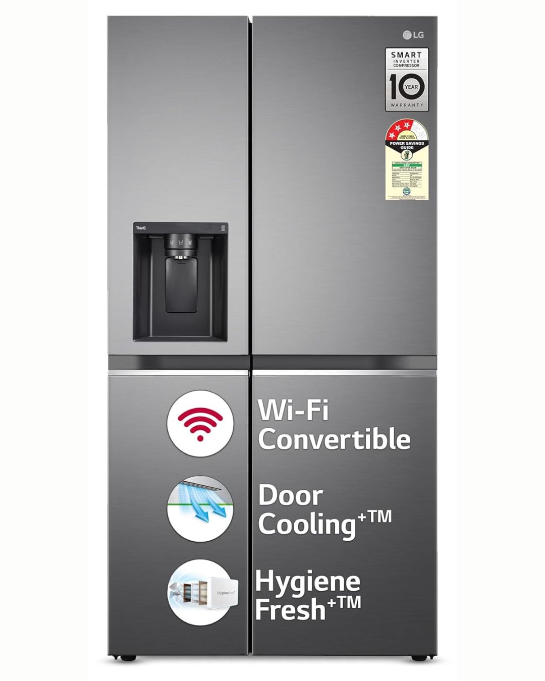 • Special Features: AI ThinQ – Optimizes cooling as per usage, Wi-Fi Convertible – Convert freezer to fridge from anywhere, Water & Ice Dispenser (UV Nano), DoorCooling+ – Extra cool air for fast and even cooling, Hygiene Fresh+ – Keep your food items fresher in a cleaner environment