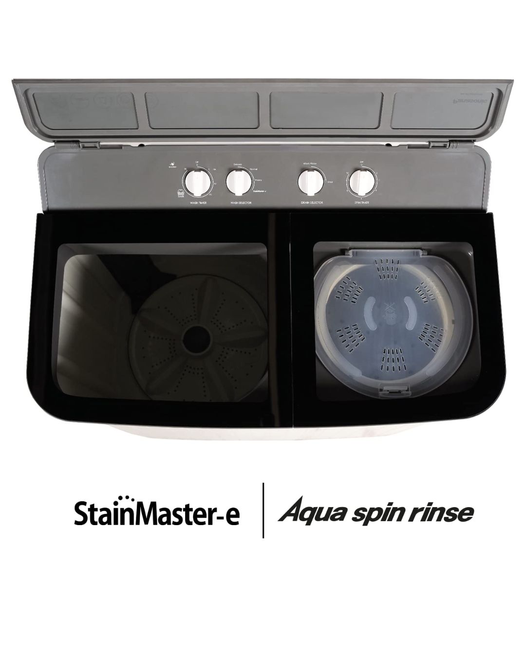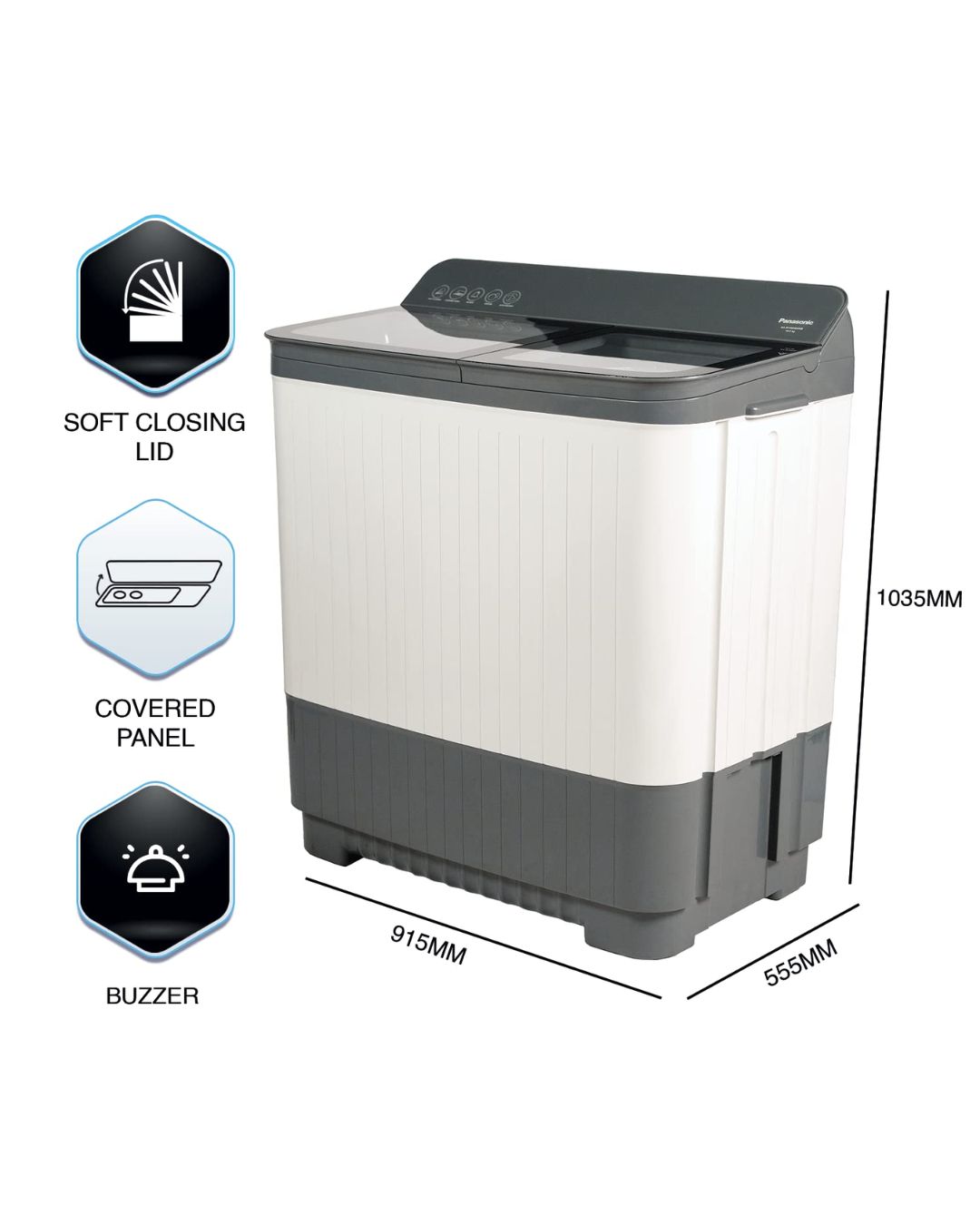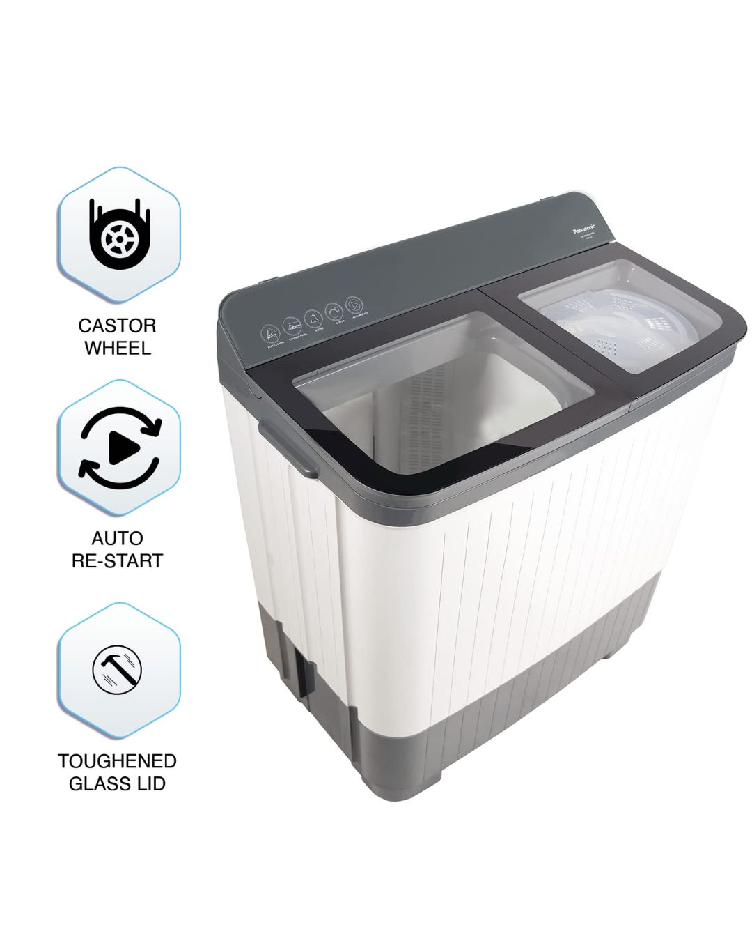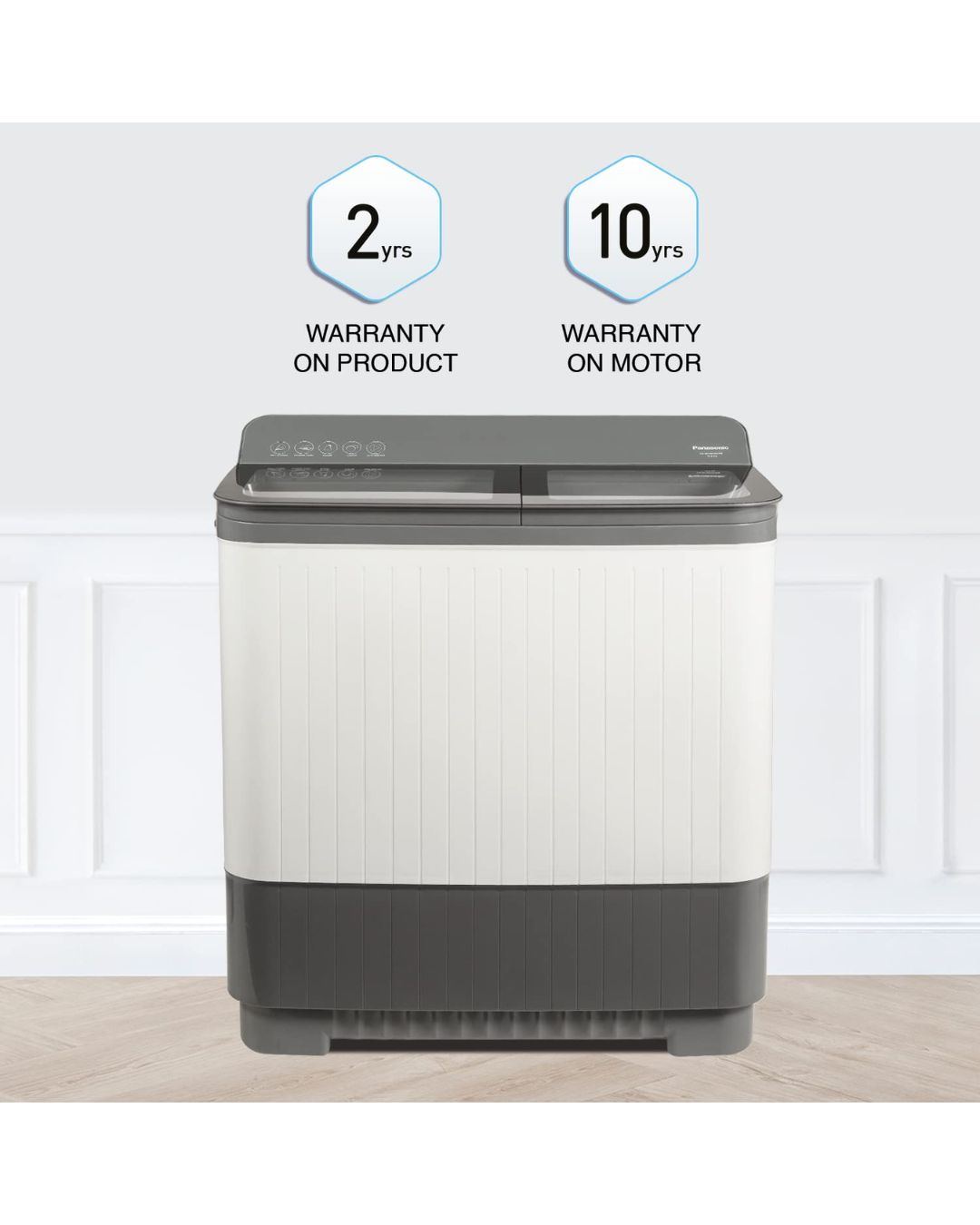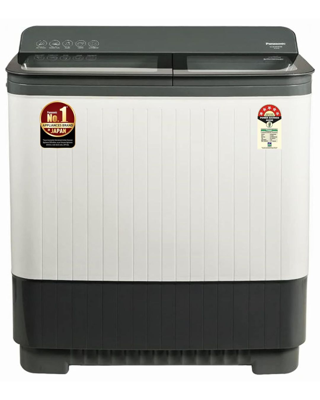 Panasonic 10 kg 5 Star Semi-Automatic Glass Lid Top-Loading Washing Machine (NA-W100H6HRB) Using the Panasonic NA-W100H6HRB (Grey), 10 kg, 5-star semi-automatic top-loading washing machine you are able to wash large loads with great convenience. The model includes a top-quality toughened glass soft-close lid, a strong motor that can spin at a speed of 750 RPM for quicker drying, and an Active-Foam system that removes deep stains by producing high-density foam. Its rustproof body, detergent box, multi-pulsator scrub system, and four washing programmes all come together in one extremely long-lasting machine that is perfect for busy households since it combines durability and effective cleaning.