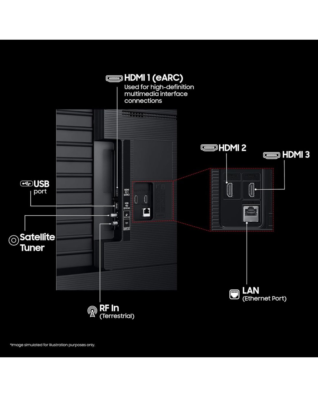 - Connectivity: Enjoy seamless integration with 3 HDMI Ports for connecting your Set-Top Box/DTH, Soundbar, Home Theater, Gaming Console, and more. Plus, stay flexible with 1 USB-A Port for easy access to Hard Drives and other USB-compatible devices. Stay connected with Wi-Fi 5, Bluetooth 5.2, and HDMI eARC, along with an Ethernet LAN Port for stable wired internet. Additional features include Anynet+ (HDMI-CEC) for unified control and RF In for Terrestrial/Cable input.