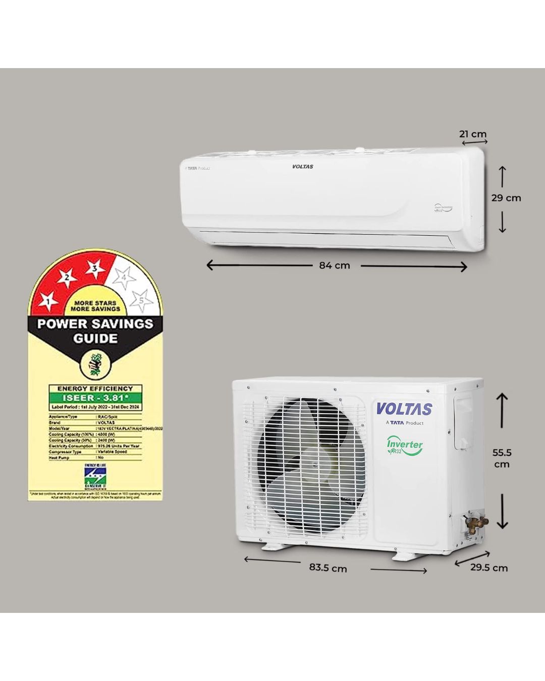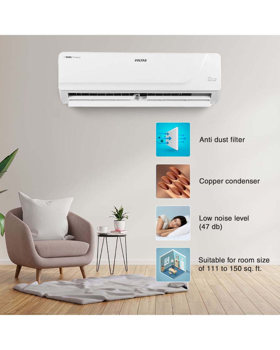Voltas 1.5 Ton 3 Star Inverter Split AC (Copper, 4-in-1 Adjustable Cooling, Anti-Dust Filter, 183V Vectra Platina, White) The Vectra 183V Platina by Voltas 1.5 Ton Inverter Split AC promises to deliver and cool down the room efficiently. It comes with a 4-in-1 adjustable mode that allows for individual cooling preferences while power consumption is reduced. An all-copper design with 100% copper condenser to provide improved longevity and a quicker rate of heat transfer, complemented by an Anti-Dust Filter that guarantees cleaner air. It is R32 refrigerant based, hence, environment-friendly as well as efficient while its smooth white appearance contributing to the room’s overall elegance. This air conditioning system is ideal for medium-sized rooms and it will constantly deliver comfort and performance that you can trust.